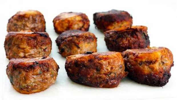 7.מחממים סיר על חום גבוה ומוסיפים 2 כוסות שמן. וטובלים את תפוחי האדמה עם המילוי בתערובת הבלילה שמכילה את שני הביצים וכף הרסק וכוס מים אחת. ומכניסים ישר לטיגון בשמן הרותח,ומטגנים משני הצדדים את התפוח אדמה עד לקבלת גוון חום זהוב.